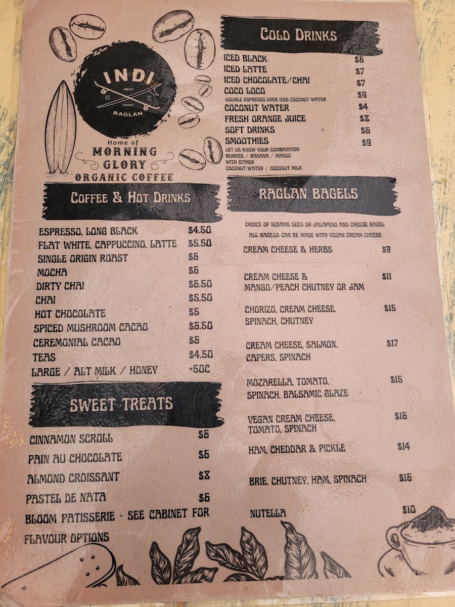 The food menu at INDI Raglan is equally delightful, featuring a variety of scrumptious options. Sink your teeth into their famous Raglan Bagels (NZ$9.50), stuffed with cream cheese, wholegrain mustard, chorizo, and fresh herbs — this locally made toasted bagel is an explosion of flavors that will leave you longing for more. Don't forget to try the Portuguese Tart (NZ$5.00), a sweet pastry filled with smooth custard and topped with a sprinkle of cinnamon; it's the perfect way to satisfy your sweet tooth after your meal.